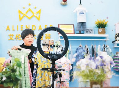 5月15日,位于山東省青島市即墨區(qū)的青島艾倫達(dá)爾服飾有限公司營(yíng)銷人員通過云直播推介產(chǎn)品。