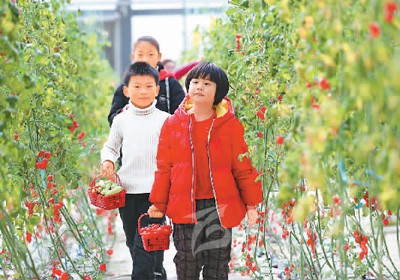 1月3日,浙江省湖州市德清縣洛舍鎮(zhèn)魚菜共生植物夢工廠,游客正在采摘新鮮的小番茄。