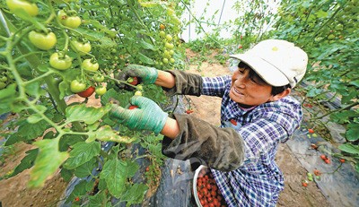 山東菏澤市曹縣孫老家鎮(zhèn)程莊村建立五色西紅柿生產(chǎn)基地,解決了村民就業(yè)問題。圖為4月8日,村民在大棚里采摘五色西紅柿。