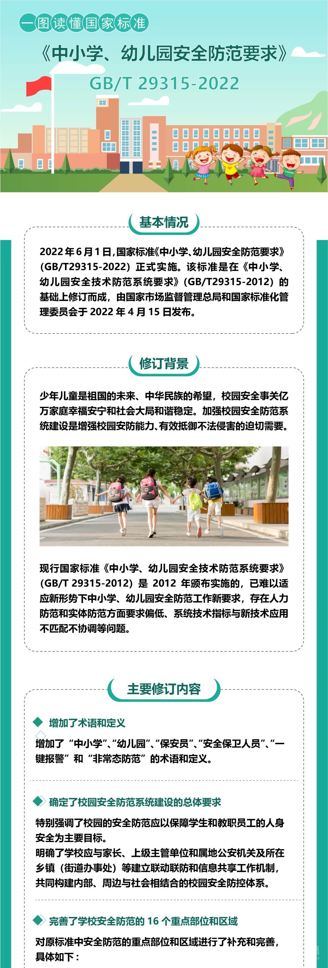 據(jù)市場監(jiān)管總局消息,近日,《中小學(xué)、幼兒園安全防范要求》(GB/T 29315-2022)(以下簡稱《要求》)經(jīng)市場監(jiān)管總局(標(biāo)準(zhǔn)委)批準(zhǔn)發(fā)布,將于2022年6月1日起正式實(shí)施。