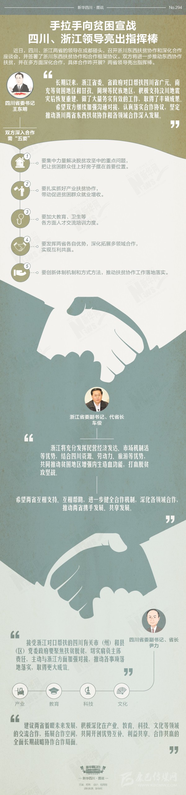 近日,四川、浙江兩省的領(lǐng)導(dǎo)在成都碰頭,召開浙川東西扶貧協(xié)作和深化合作座談會(huì),并簽署了浙川東西扶貧協(xié)作和合作框架協(xié)議。雙方將進(jìn)一步推動(dòng)?xùn)|西協(xié)作扶貧,并在多方面深化合作,具體合作咋開展??jī)墒〉念I(lǐng)導(dǎo)亮出指揮棒。
