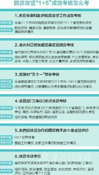 如何考?省扶貧開發(fā)局相關(guān)負(fù)責(zé)人介紹,具體而言,就是將黨委和政府脫貧攻堅(jiān)工作成效考核、省直部門(單位)定點(diǎn)扶貧考核、扶貧專項(xiàng)考核、省內(nèi)對口幫扶藏區(qū)彝區(qū)貧困縣考核、貧困村“五個(gè)一”幫扶考核、東西部扶貧協(xié)作和藏區(qū)攜手奔小康成效評價(jià)統(tǒng)一整合為脫貧攻堅(jiān)成效考核,一支隊(duì)伍完成所有考核。
