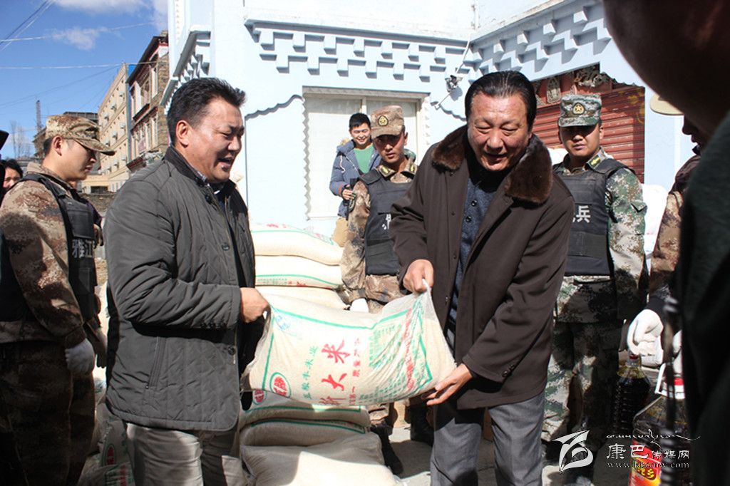 州政協(xié)副主席、縣委書(shū)記阿基布珠(右),縣委副書(shū)記、縣長(zhǎng)旦燈(左)發(fā)放救災(zāi)物資。