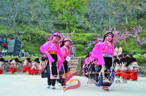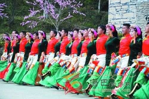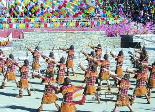 10月26日,在甲居藏寨,處處洋溢著豐收和歡樂(lè)的氣氛,人們扶老攜幼,身著節(jié)日的盛裝走到一起,來(lái)共同慶祝丹巴嘉絨風(fēng)情節(jié)的順利召開(kāi)。在一塊空地中,搭建了臨時(shí)的舞臺(tái),看臺(tái)上,幾座古碉模型傲然挺立,在不遠(yuǎn)處,一座古碉矗立在一座小山包上,與古碉模型遙相呼應(yīng)、相映成趣。上午9時(shí)40分,當(dāng)節(jié)目主持人宣布嘉絨風(fēng)情節(jié)正式開(kāi)始時(shí),一束束搖曳的煙花向空中飛去,在空中炸響后,散發(fā)出五顏六色的煙霧,其中有的還幻化成幾多小小的降落傘,就像多多盛開(kāi)的鮮花在空中綻放。演出現(xiàn)場(chǎng)前的大地和遠(yuǎn)處的小山坡上到處都站滿了熱情的觀眾,合著禮花的爆裂時(shí)的響聲,將手中的小紅旗展開(kāi),高舉過(guò)頭頂,有節(jié)奏的左右搖動(dòng),霎時(shí)間,整個(gè)現(xiàn)場(chǎng)成為了紅色的海洋。