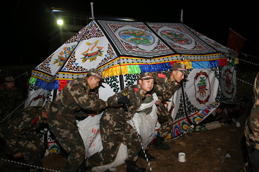 武警官兵連夜搭建帳篷。
