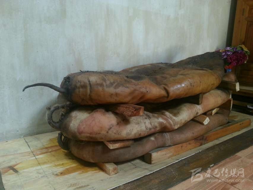 半干豬肉:在丹巴縣革什扎鄉(xiāng)有一種比較奇特的豬肉保存方法:將豬殺死后,不去毛,只在豬的腹部開一條口子取出內(nèi)臟,將血水清理干凈后用麻繩將腹部縫合。隨后用當(dāng)?shù)氐狞S泥漿敷在豬身上,在豬的身上形成一個厚約2厘米的殼,密不透風(fēng)。處理好后將其懸掛于灶塘之上,使黃泥在高溫的烘烤下快速硬化。如若發(fā)現(xiàn)黃泥層出現(xiàn)裂縫,立即用黃泥漿將其修復(fù)。等到第二年熱天時,敲掉黃泥形成的硬殼,豬毛被輕松退去,豬肉依然比較新鮮。但這種保存新鮮豬肉的方法現(xiàn)在已經(jīng)很少見了,一是因為這種保存方法風(fēng)險太大,稍有不慎豬肉就可能腐敗;二是如今物資供應(yīng)豐富,新鮮豬肉購買方便,使得此種儲存方式失去了存在的價值。