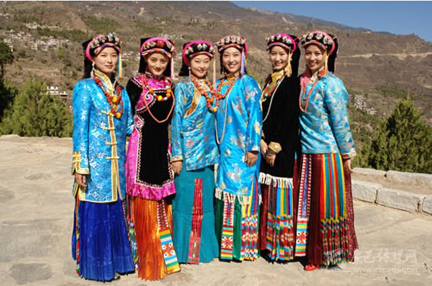 以丹巴縣和康定縣大渡河沿岸為代表??刀~通區(qū)和雅拉鄉(xiāng)一帶又自有特點。以長方形黑金絲絨底繡花頭帕對折,戴于頭上,額前伸出約數(shù)厘米,腦后下披至后頸,寬至兩鬢,然后用大紅頭繩或五彩頭繩瓣發(fā)盤于帕上,辮子套各式辮飾。外披披風,一般是條紋白色或原初皮毛披風,內穿錦緞上衣,下著五彩百褶長裙,腰系絲織或綢質彩色花腰帶,男戴金絲帽,足穿彩靴為風彩。嘉絨地區(qū)服飾還受羌族習俗的影響,生活俗裝普遍穿長等衫,以藍黑色為主,下身系圍腰,腰扎寬大彩帶,冬天穿羊皮褂或羊毛織成的無領服等。