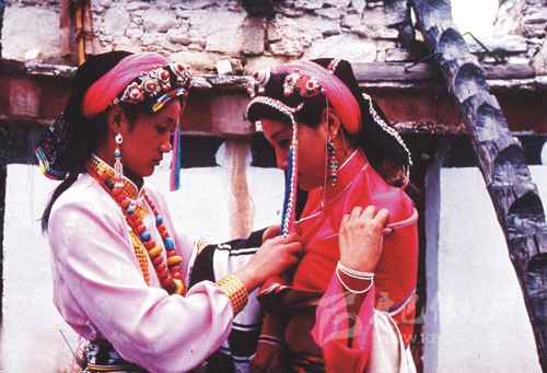 康北農(nóng)區(qū)婦女頭飾較簡(jiǎn)略,僅用小型銀盤花和少量紅珊瑚、琥珀裝飾,多用綠松石珠裝飾額際雙鬢細(xì)辮子。